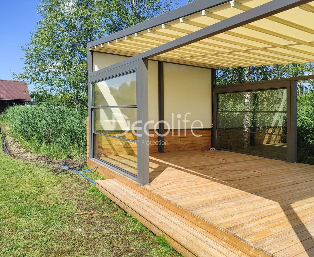Пергола Decolife Basic&Pro New + Гильотинное остекление W600 + Вертикальная система Zip 130 - г. Миоры