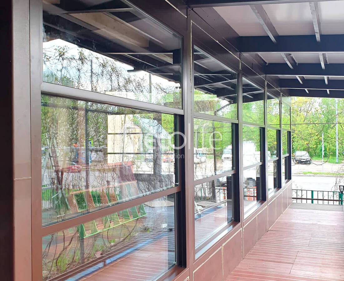 Каркас конструкции представляет собой систему алюминиевых элементов, которые обладают повышенной стойкостью к повреждениям и распространению ржавчины. Систему дополняют специальные стекла, которые обладают отличными прочностными характеристиками. Остекление красиво зонирует и оформляет пространство, помогает сохранять комфорт.